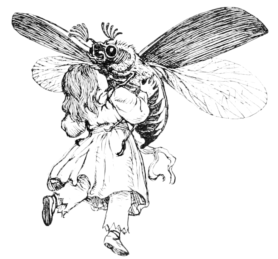 Pero de repente se presenta un saltón muy grande, (abejorro) y con sus repugnantes patas agarra á la Pulgarcilla por la cintura y se la lleva á un árbol. La hoja de nenúfar continuaba bogando río abajo, guiada por la mariposa. ¡Dios mío, y qué de congojas, pasó la pobre niña al verse colocada entre las altas ramas de un árbol! Pero á decir verdad lo que más le inquietaba era la suerte de la mariposa expuesta á morirse de hambre, si no lograba desasirse.