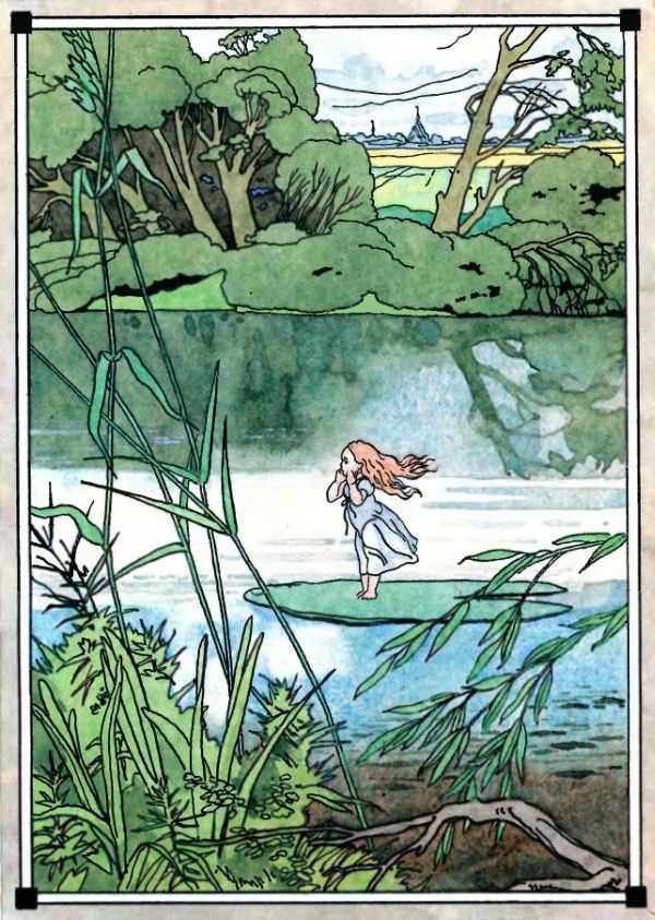 —«Cuidado, dijo el viejo, no grites, que podrías despertarla y se nos escaparía, pues has de entender que es tan sutil y ligera como el plumón del cisne. Vamos á colocarla sobre una de esas anchas hojas de nenúfar que crecen en medio del arroyo; allí estará como en una isla y no podrá escurrirse. En tanto iremos nosotros á preparar nuestra casa al fondo del pantano, para recibirla dignamente y celebrar las bodas.»