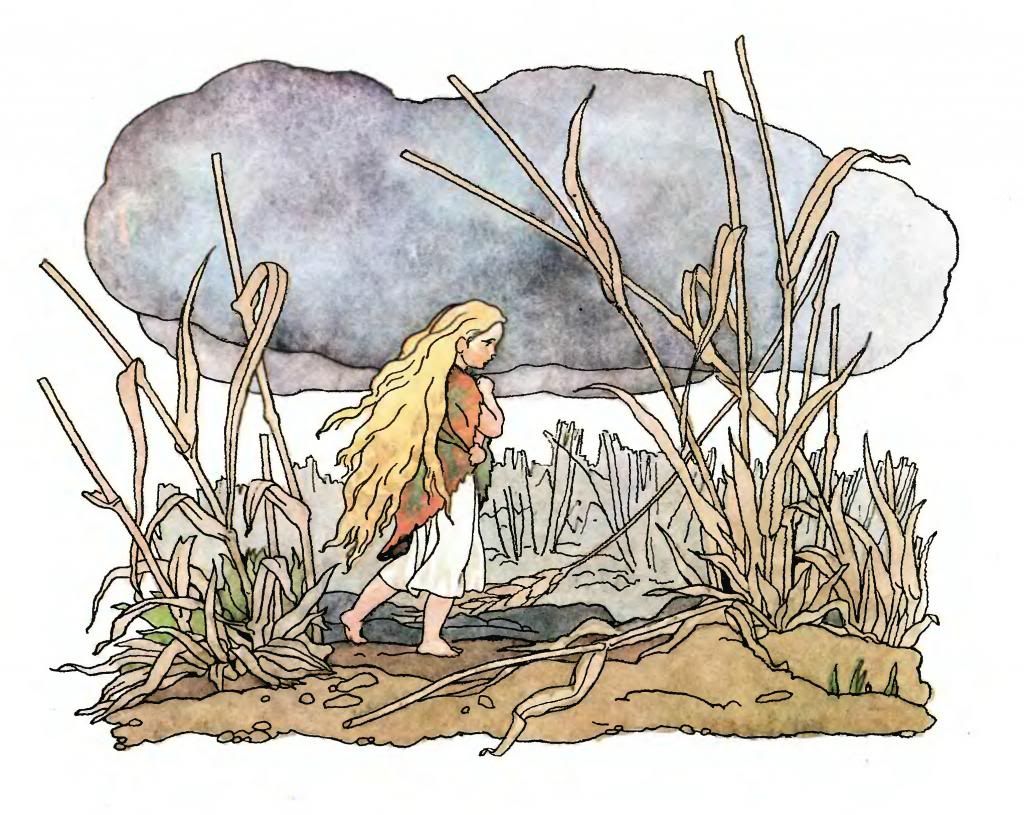 Era el tiempo cada vez más cruel y riguroso, y cuando llegaron las nieves, cayó un copo sobre la pobre niña, haciéndola bambolear bajo su peso. Entonces se refugió bajo un montón de hojas secas; pero estas, aparte de que se tronchaban, no le daban calor ninguno. ¡Cuánto sufrió la pobre! Por último se armó de valor y corrió á la ventura en busca de un asilo: traspuso los linderos del bosque, llegó á un gran campo de pan llevar erizado de rastrojos cuyos tallos parecían agudas estacas clavadas en la tierra helada; sin embargo la niña, tiritando de frío, se introdujo en aquel peligroso laberinto.