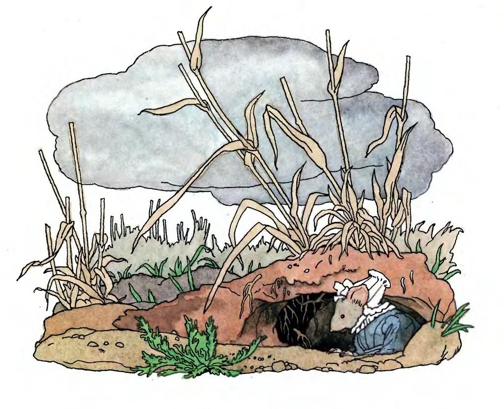 De pronto tropezó, por haber metido el pie en un agujero que levaba al escondrijo de una rata silvestre, dueña y señora de una confortable vivienda subterránea perfectamente resguardada y bien provista de trigo, arvejas, guisantes y otras semillas. Hostigada por la necesidad, la Pulgarcilla hizo abdicación de su amor propio y tendió la mano á la rata como una mendiga, pidiéndole por caridad medio grano de cebada, pues hacía dos días que no había comido.