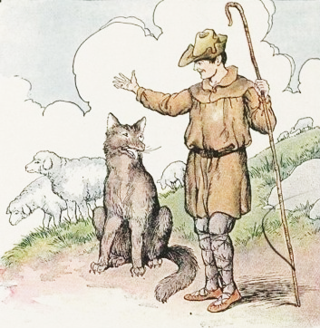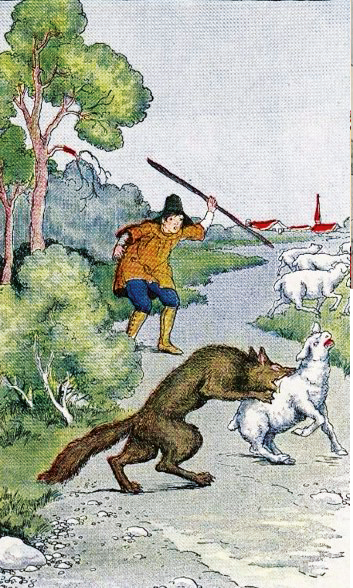 Entonces, una tarde, mientras el sol se ponía detrás del bosque y las sombras se arrastraban sobre los pastos, un Lobo realmente saltó de la maleza y cayó sobre las ovejas.