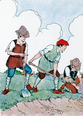 El padre murió, y tan pronto como estuvo en su tumba, los hijos se pusieron a trabajar cavando con todas sus fuerzas, removiendo cada palmo de tierra con sus palas, recorriendo toda la finca varias veces.