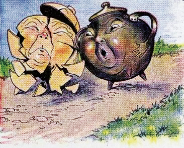 Así que la Olla de Barro finalmente dio su consentimiento y las dos partieron una al lado de la otra, moviéndose cada una sobre sus tres patas rechonchas, de un lado a al otro, y chocando a cada paso.