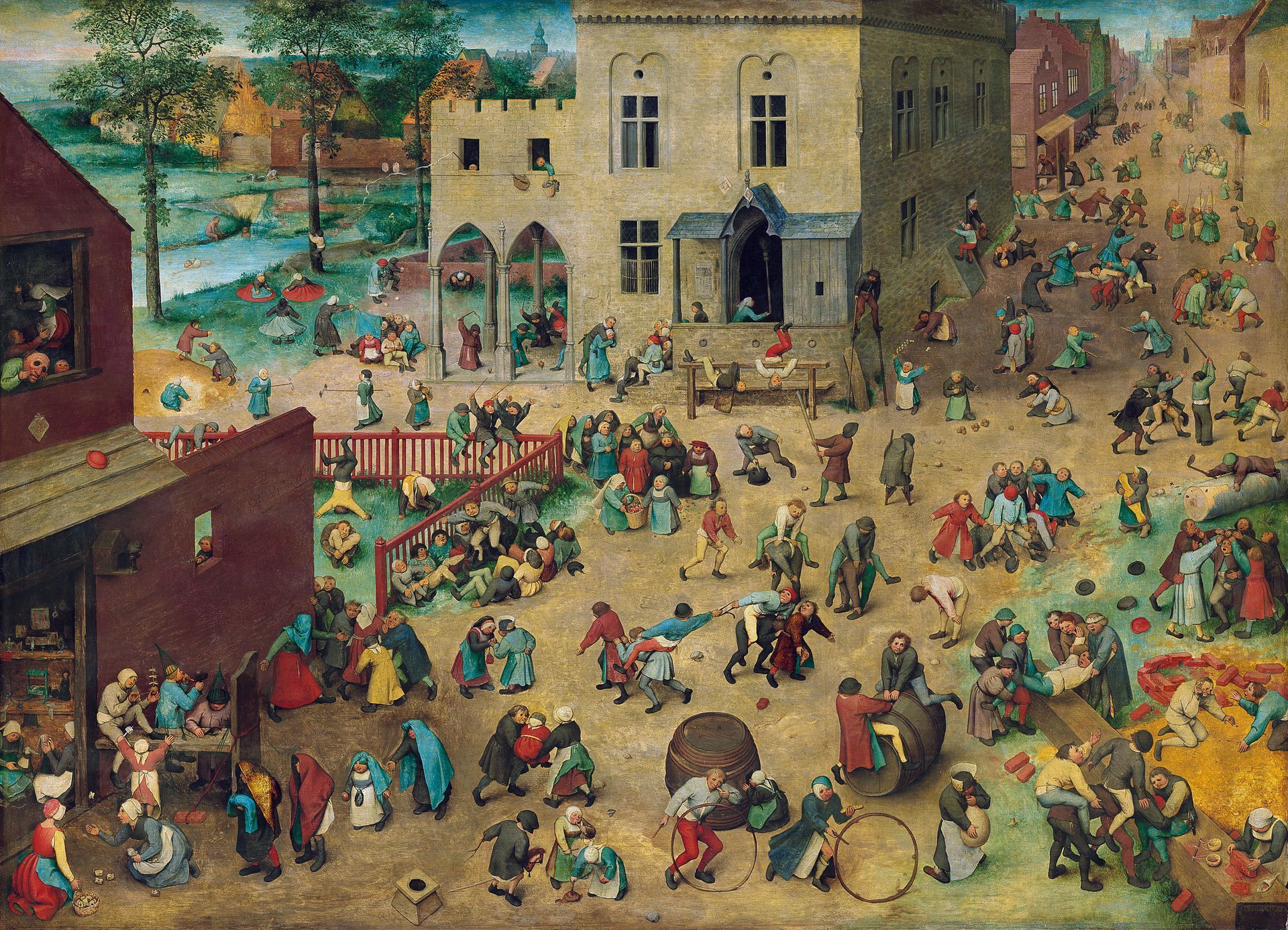 El cuadro “Juegos de niños” (Óleo sobre tabla, de 118 x 161 cm, actualmente expuesto en el “Kunsthistorisches Museum” de Viena) pintado en 1560 por Pieter Bruegel “el Viejo”, nos muestra 83 juegos diferentes, según los expertos del museo, de los que están disfrutando 230 niños. Son juegos tan actuales, para los de mi quinta, como el de la gallinita ciega, al aro, a la peonza, al caballito, a las tabas, a la pídola, a la silla de la reina, a hacer pompas de jabón, a las tiendas, a las muñecas,