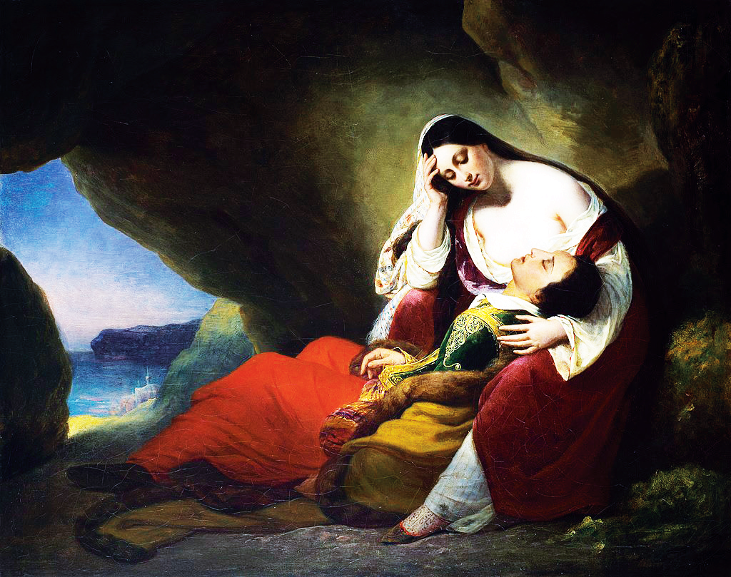 (Cae DON JUAN a los pies de DOÑA INÉS, y mueren ambos. De sus bocas salen sus almas, representadas en dos brillantes llamas que se pierden en el espacio al son de la música. Cae el telón).