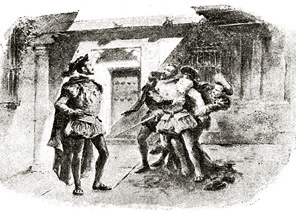Don Gonzalo de Ulloa, el comendador de Calatrava y el padre de doña Inés, entra a la hostería para presenciar la contienda. Para que oculte su identidad, Buttarelli le entrega un antifaz.