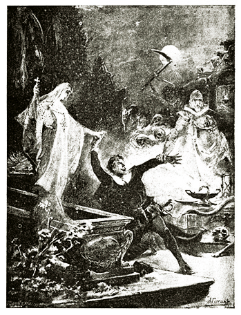 Tenorio, de rodillas, tiende la otra mano al cielo y, en ese momento, se abalanzan sobre él los espectros.