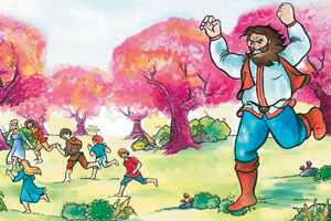 Un día el gigante regresó. Había ido a visitar a su amigo, el ogro de Cornualles, y permaneció con él durante siete años. Transcurridos los siete años, había dicho todo lo que tenía que decir, pues su conversación era limitada, y decidió volver a su castillo. Al llegar vio a los niños jugando en el jardín: —¿Qué estáis haciendo aquí? —les gritó voceanddo. Y los niños salieron corriendo.