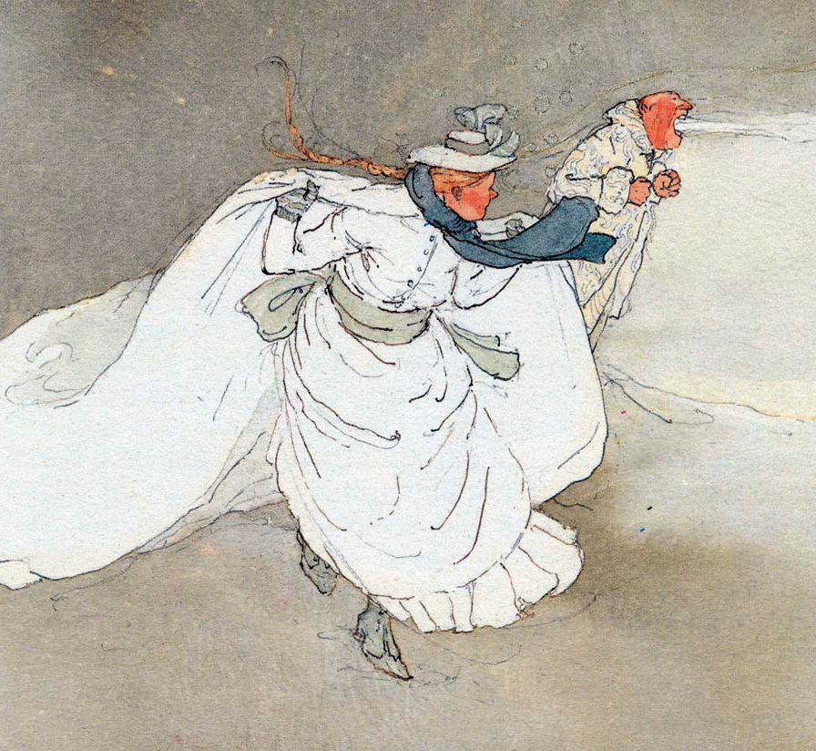 Quién llegó (el Viento) envuelto en pieles y aullaba todo el día por el jardín, derribando los capuchones de la chimeneas: