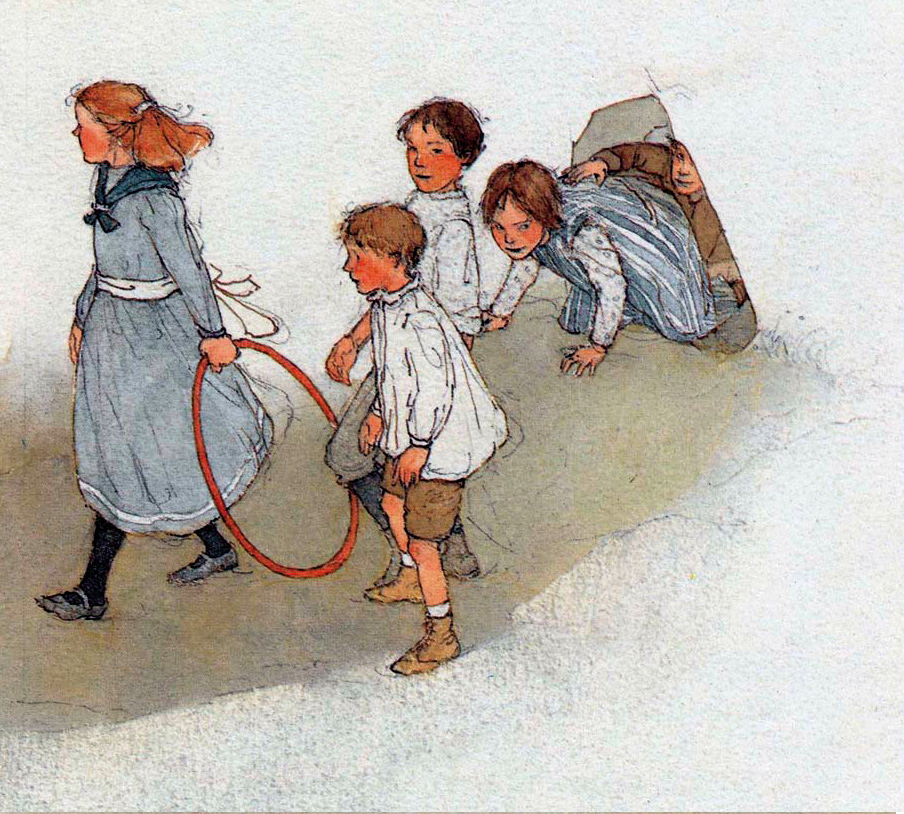 Revoloteando salieron de todas las flores verdaderos enjambres de menudos señoritos y señoritas, deseosos todos de prestar homenaje á su nueva soberana. Cada uno era portador de un regalo, siendo el que más agradó á la novia, un par de alas brillantes como el nácar más puro. La Pulgarcilla se las puso y desde entonces pudo revolotear libremente por los aires.