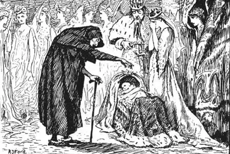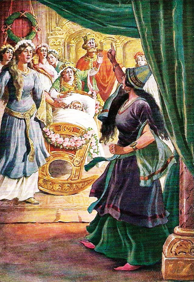 En el momento sentarse a la mesa, vieron entrar una vieja hada que no había sido invitada, debido a que durante más de cincuenta años no había salido de una torre y se la creía muerta o encantada.