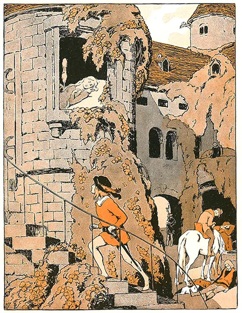 Impulsado por el amor y el deseo de gloria, resolvió saber en el acto si era exacto lo que el campesino le había dicho, y apenas llegó al bosque cuando todos los viejos árboles, los rosales silvestres y los espinos se separaron para abrirle paso. Caminó hacia el castillo, que veía al extremo de una larga alameda, en la que penetró, quedando muy sorprendido al observar que los de su comitiva no habían podido seguirle porque los árboles volvieron a recobrar su posición natural y a cerrar el paso en cuanto hubo pasado. No por eso dejó de continuar su camino, pues un príncipe joven y enamorado siempre es valiente. Penetró en un extremo del patio, y el espectáculo que a su vista se presentó era capaz de helar de miedo