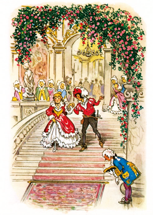 La dama de honor, hambrienta como las demás, se impacientó y dijo a la princesa que la comida estaba servida. El príncipe la ayudó a levantarse. Estaba vestida con mucha magnificencia, pero guardose de decirle que su traza y tocado se parecían a los de su abuela y que, la moda del cuello que llevaba había pasado hacía mucho tiempo; pero su vestido y adornos en nada disminuían su belleza.