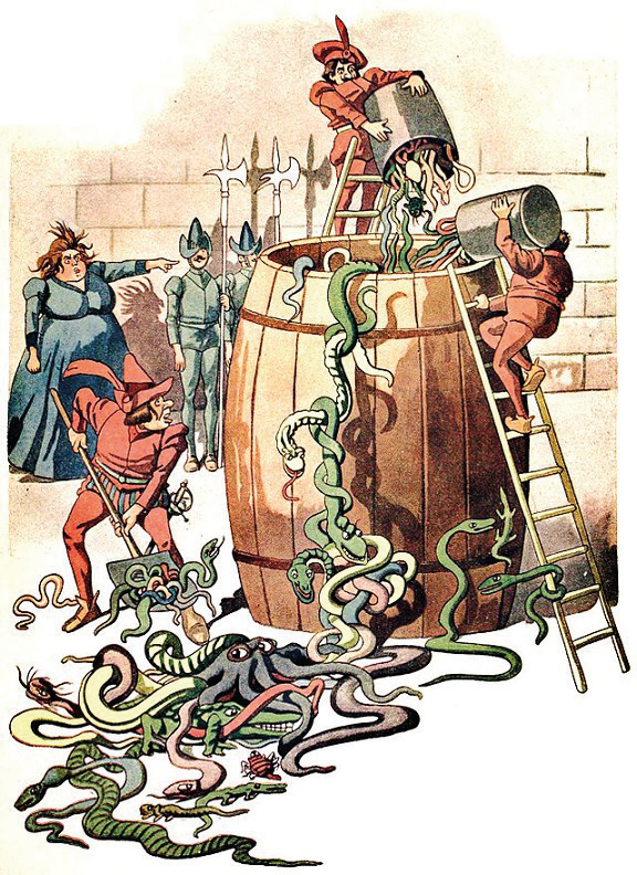 Que pusieran en medio del patio un enorme tonel que hizo llenar de sapos, víboras, culebras y serpientes para arrojar en él a la reina, sus hijos y al mayordomo, su mujer y su criada, mandando que los trajeran con las manos atadas a la espalda.