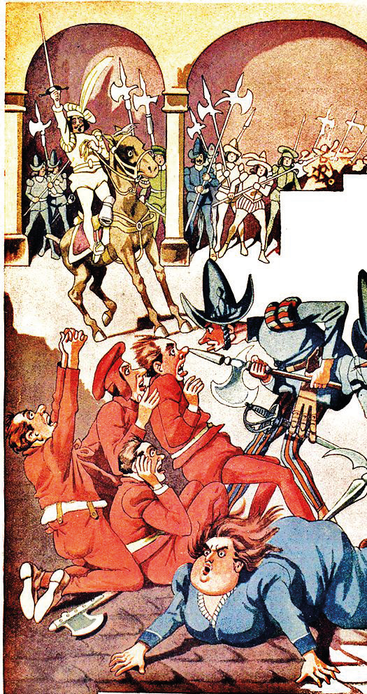 En el patio estaban los infelices, y los verdugos se disponían a echarlos en el tonel, cuando el rey, a quien no se esperaba tan pronto, entró de repente a caballo. Había corrido mucho y preguntó muy admirado qué significaba aquel horrible espectáculo.