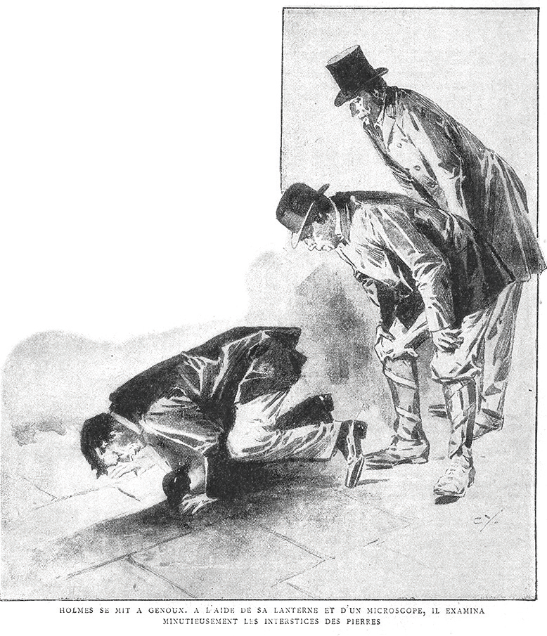 El solemne señor Merryweather se encaramó a una de las jaulas de embalaje mostrando gran disgusto en su cara, mientras Holmes se arrodillaba en el suelo y, sirviéndose de la linterna y de una lente de aumento, comenzó a escudriñar minuciosamente las rendijas entre losa y losa. Le bastaron pocos segundos para llegar al convencimiento, porque se puso ágilmente en pie y se guardó su lente en el bolsillo.