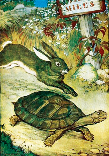Pero la Liebre siguió durmiendo muy tranquilamente; y cuando por fin despertó, la Tortuga estaba cerca de la línea de la meta.