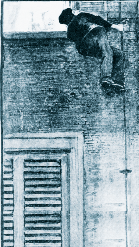 El problema siguiente era la forma de descenso. Sobre este punto me encontraba ya satisfecho desde nuestro paseo alrededor del edificio. A cinco pies y medio más o menos de la ventana en cuestión se eleva un pararrayos. Desde este poste habria sido difícil para cualquiera alcanzar la ventana, no digo entrar. Observé, sin embargo, que las persianas del cuarto piso eran de aquella clase particular que los carpinteros parisienses llaman ferrades, forma muy poco usada en la actualidad, pero que se ve con frecuencia en las casas antiguas de Lión y de Burdeos. Son semejantes a una puerta ordinaria de una sola hoja, excepto en su mitad superior hecha en forma de celosía, o labrada a manera de enrejado; ofreciendo así excelente apoyo para las manos. En esta casa las persianas tienen muy bien tres pies y medio de anchura. Cuando las divisé desde la parte trasera del edificio, estaban ambas abiertas hasta la mitad, es decir, formando ángulo recto con el muro. Es probable que la policía haya examinado como yo la espalda de la casa; pero de ser así, no advirtió la gran anchura de las persianas, o no le prestó por lo menos la debida consideración. En efecto, persuadidos de que no había salida de este lado, naturalmente descuidaron examen más minucioso. Era claro para mí, sin embargo, que la persiana correspondiente a la ventana situada a la cabecera del lecho llegaría a cerca de dos pies de distancia del pararrayos, si se dejaba caer por completo sobre el muro. Era también evidente que poniendo en juego un grado extraordinario de vigor y de audacia, podía efectuarse la entrada por la ventana escalando el pararrayos. Una vez llegado a la distancia de dos pies y medio (suponiendo que la persiana estuviera abierta en toda su extensión), podía encontrar el ladrón sólido apoyo en el enrejado. Demos pues por sentado que escaló el poste afirmando los pies contra el muro, y que lanzándose de allí intrépidamente hizo oscilar la persiana en forma de cerrarla; y suponiendo que la ventana estuviese abierta, pudo deslizarse él mismo dentro de la habitación.