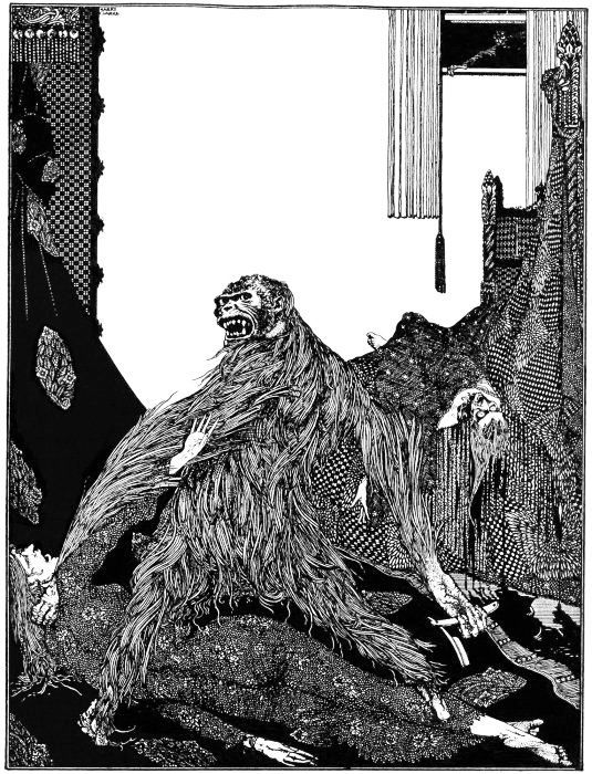 La hija yacía privada de movimiento: se había desmayado. Los gritos y la lucha de la anciana, durante la cual le fueron arrancados los cabellos, convirtieron en ira los hasta entonces pacíficos propósitos del orangután. Con deliberado empuje de su brazo musculoso separó casi completamente la cabeza del tronco. La vista de la sangre enardeció su ira convirtiéndola en frenesí. Rechinando los dientes y echando fuego por los ojos, lanzóse sobre el cuerpo de la joven e incrustó sus temibles garras en la garganta de Mademoiselle L'Espanaye reteniendo su aliento hasta que expiró. Sus miradas furtivas y salvajes fijáronse entonces en la cabecera del lecho sobre la cual pudo distinguir el rostro de su amo, rígido por el horror. La furia de la fiera, que no dudaba que su amo llevaba aún el temible látigo, se convirtió instantáneamente en pavor. Consciente de merecer castigo, parecía deseosa de ocultar sus sangrientas hazañas y se removía en torno del aposento en agonía nerviosa de agitación, echando abajo los muebles y destrozándolos en su ir y venir, y arrancando y tirando al suelo los cobertores y colchones del lecho.
