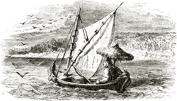 No me di por vencido y entonces construí un pequeño barco con la intención de dar la vuelta a mi pequeño reino; pero después de estar en el mar tres días y tres noches, y casi perder la vida, llegué sano y salvo a tierra. Y al cuarto día, casi muerto de fatiga, llegué por fin a mi pequeño castillo.