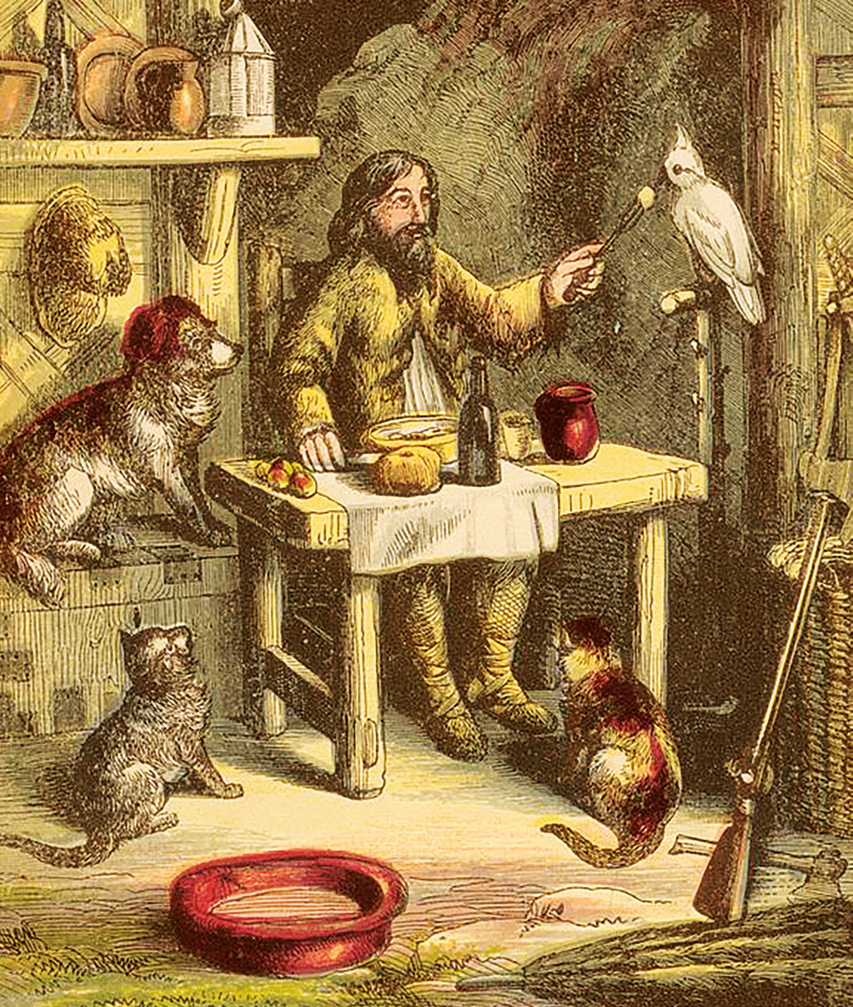 Había traído del barco algunas plumas, tinta y papel; algunos instrumentos matemáticos y tres buenas Biblias, junto con varios otros libros, que conseguí trasladar cuidadosamente. También traje a la orilla dos gatos y un perro nadó en la orilla, el cual fue un fiel sirviente para mí durante muchos años; es más, era tan buen compañero para mí, que no me faltaba nada que pudiera ir a buscarme; y él sólo necesitaba oír mi voz para convertirse en un amigo muy agradable al que no le faltaba alimento; al igual que a los otros animales.