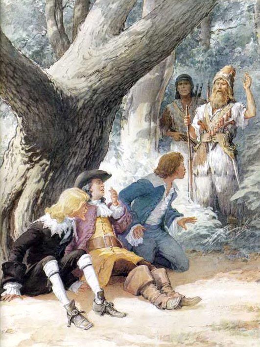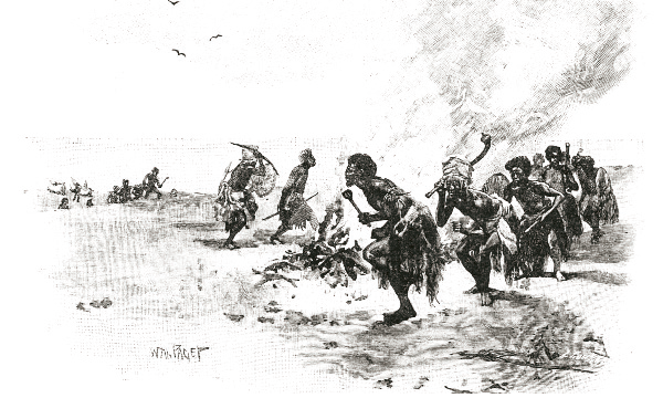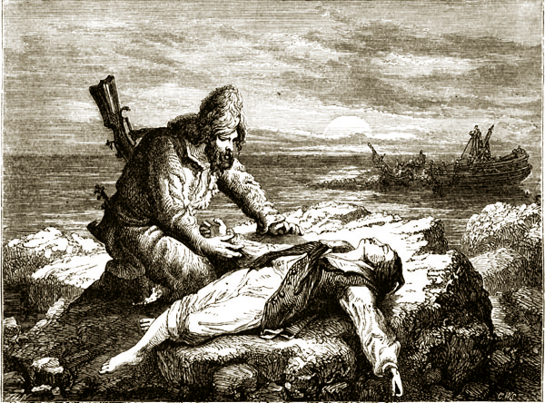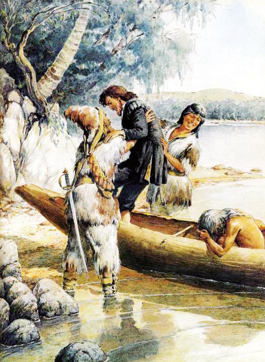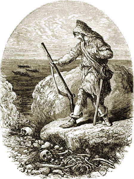 Una mañana, muy temprano, subí a la colina y descubrí a unos salvajes desembarcando de cinco canoas. Poco después vi a dos miserables muchachos sacados de los botes; uno de los cuales fue inmediatamente derribado; pero el otro, partiendo de ellos, corrió con velocidad indecible hacia mí. Me asusté cuando lo vi venir, imaginando que vendría seguido por todos los demás; sin embargo, mantuve mi posición y perdí mis temores cuando descubrí que sólo tres lo seguían. Rápidamente fui a buscar mi arma; y tomando un atajo colina abajo, me interpuse entre los perseguidores y los perseguidos, gritando en voz alta al que huía, y luego haciéndole señas con la mano para que se detuviera. Luego, corriendo detrás del primero, lo derribé. con la culata de mi arma y luego lo maté de un disparo.
