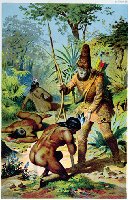 El pobre salvaje que había huido, quedó tan aterrorizado por el ruido de mi arma que se quedó inmóvil, pero parecía más inclinado a huir que a venir hacia mí. Sin embargo, cuando le hice señales de que se me aproximara, se me acercó, arrodillándose cada diez o doce pasos. Ya junto a mí, arrodillado apoyó la cabeza en el suelo y puso mi pie sobre ella.