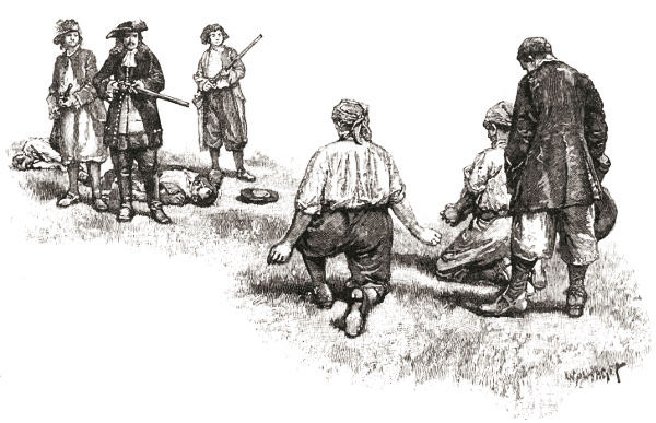 Tirando la barca al suelo, como la marea estaba baja, nos dispusimos a encontrarnos con los demás que regresaban del bosque. Entonces, inmediatamente, el capitán disparó y mató al contramaestre, que era el cabecilla del motín.