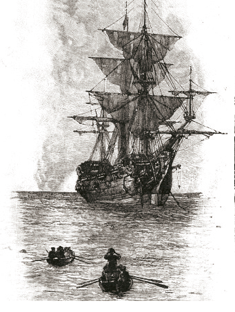 Unos ocho días después de su partida, Viernes me despertó una mañana gritando: “¡Maestro, ya han venido!” Me vestí y me apresuré a subir a la cima de la colina, y descubrí claramente un barco inglés anclado.
