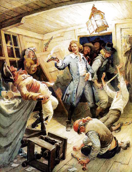 Tomamos un bote y nos dirigimos hacia él; rápidamente y por sorpresa, subimos a bordo, Lo primero que hizo el capitán fue matar a tiros al capitán pirata, el segundo disparó a otro, y luego los demás se rindieron.
